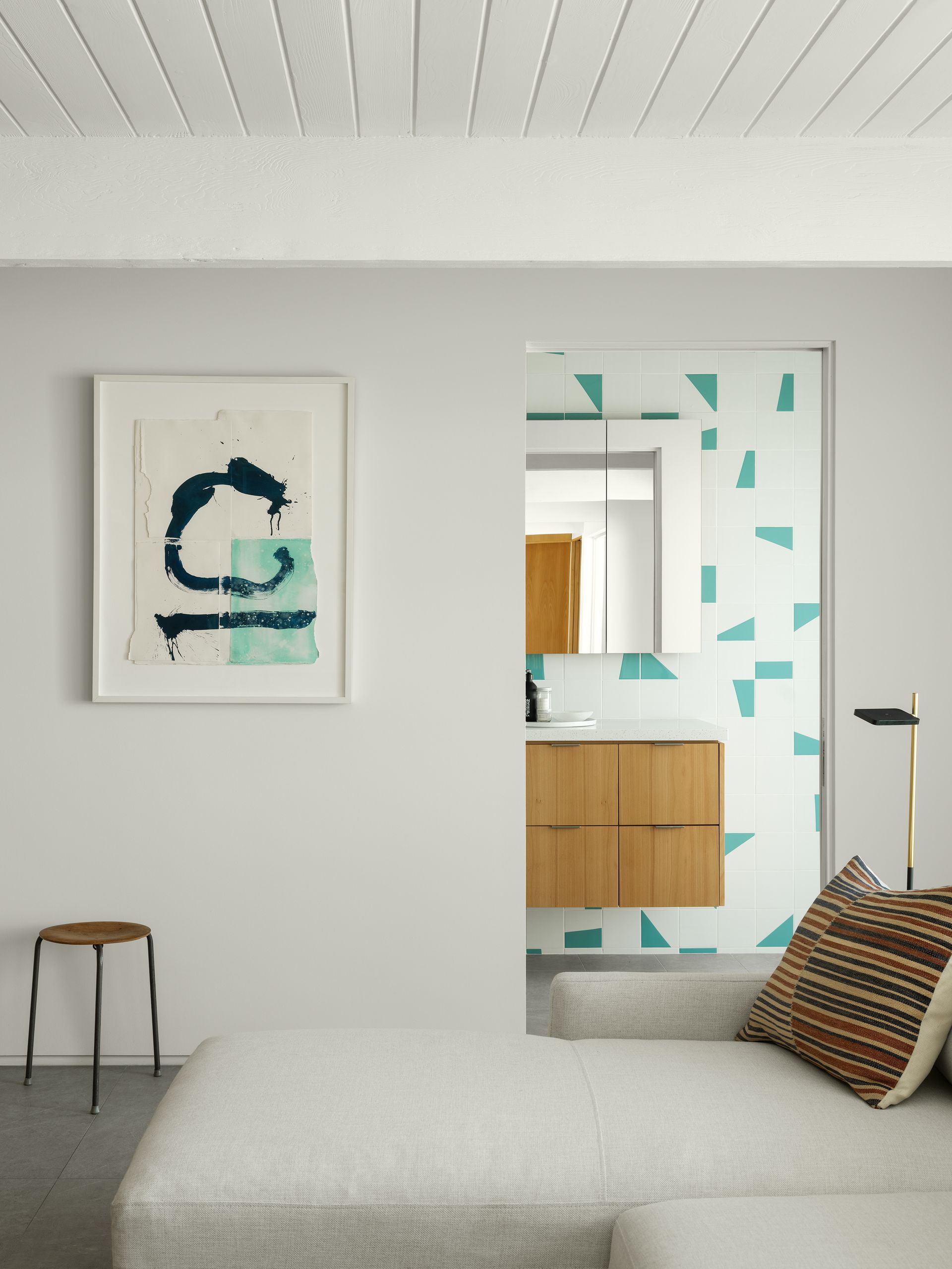 Art is an important component throughout the house. Existing pieces were rethought (from bedroom to entry) and reframed (from off-the-shelf to custom fabrication). New pieces were acquired with the criteria that there had to be a personal connection to the artist or piece. Even the tile was chosen as art— layouts were drawn by hand before the installation.
