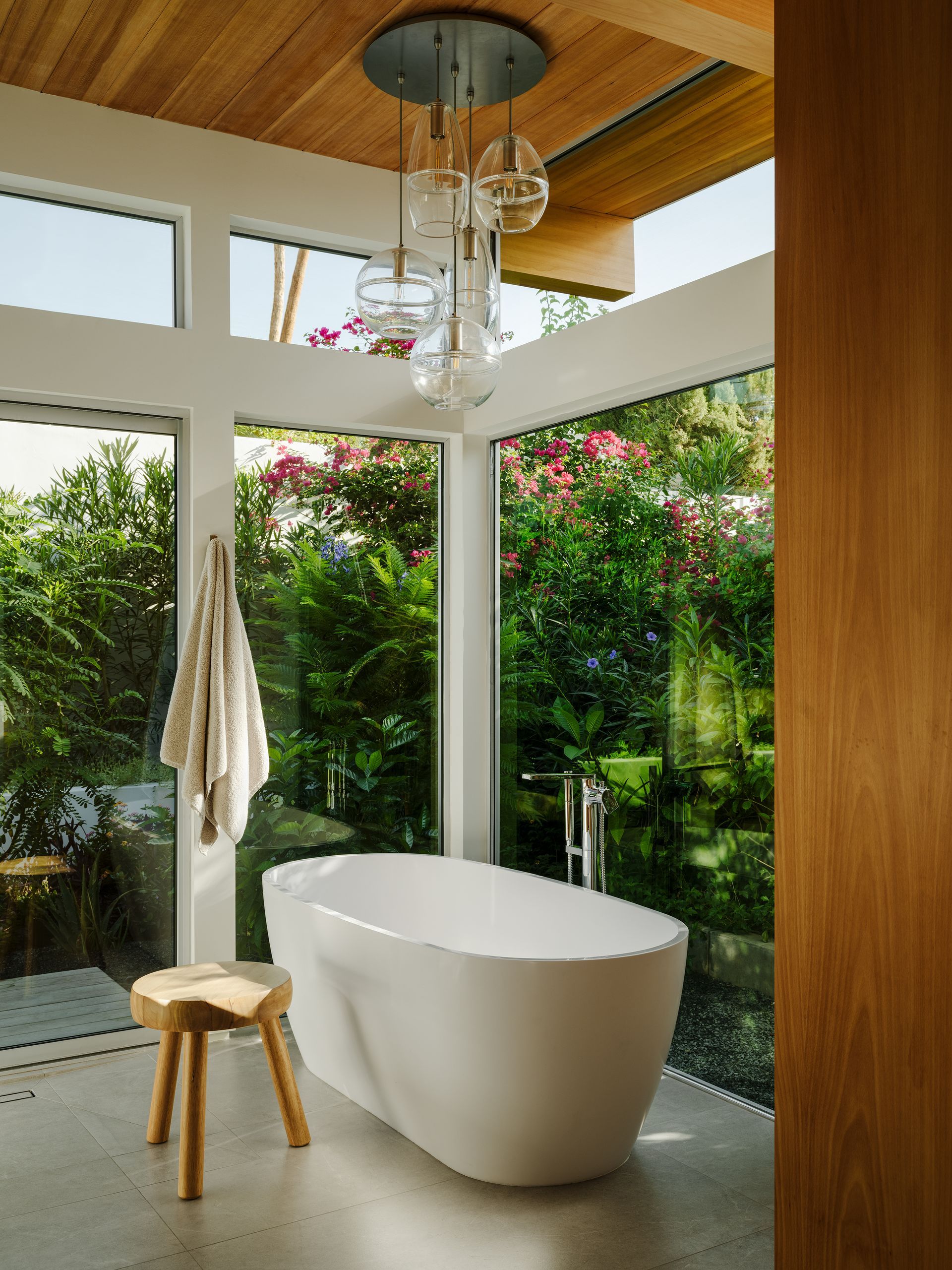 We asked the architect for paneled headboard walls throughout. This allowed us to keep the beds low— both period-appropriate and modern—while still creating warmth and scale. We designed floating nightstands for each of the guest rooms. The primary bath includes a freestanding tub to take in the garden. A custom hand-blown pendant hangs above.