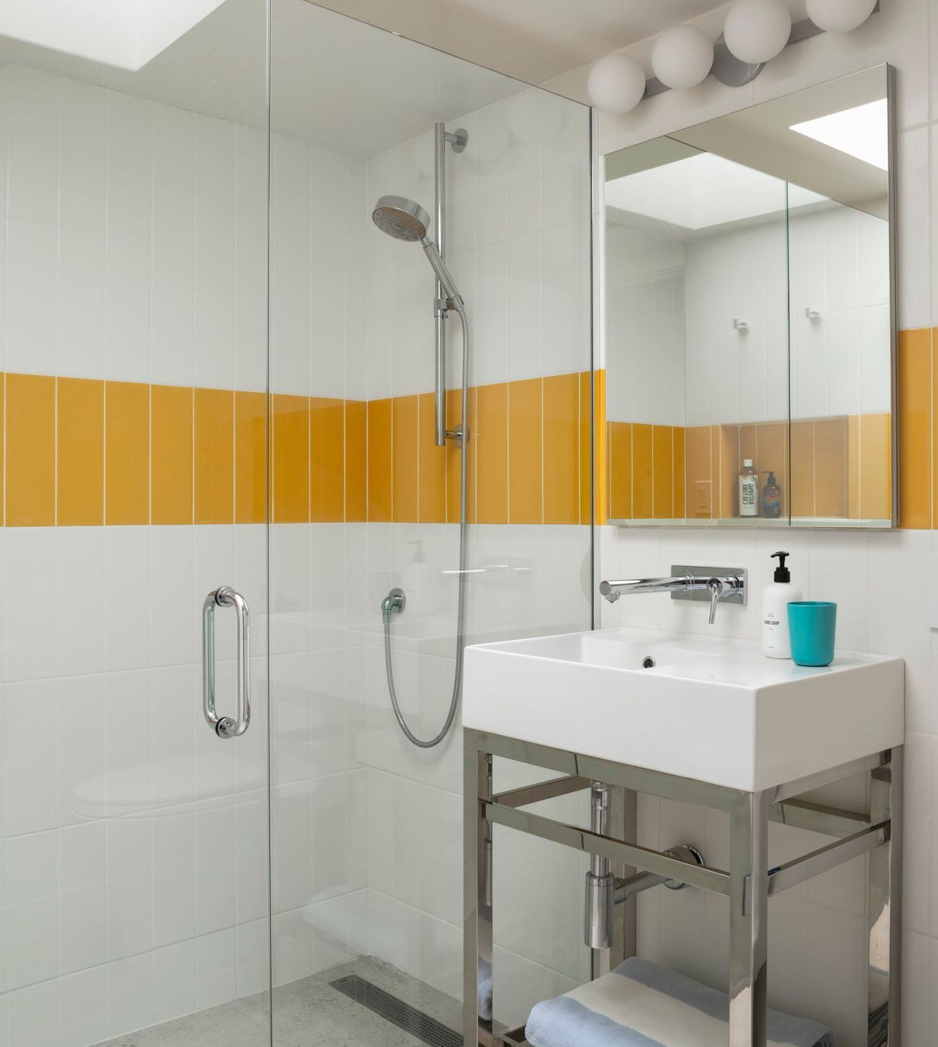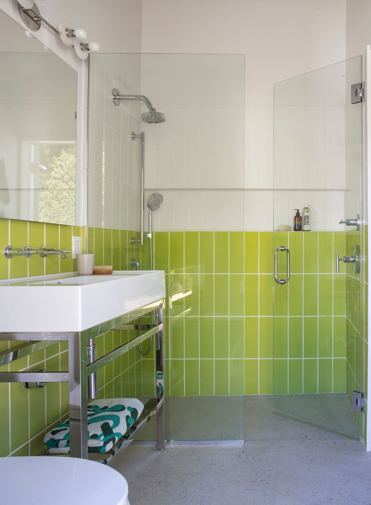 The clients—both creatives—had some solid ideas about color. With only 1250 sq feet, it was important to create consistency while still allowing for nuance and surprise. Consistency came with continuous flooring (even into the showers) and wall color. Shifting the weights and tones of their green/gold palette provided the surprise.