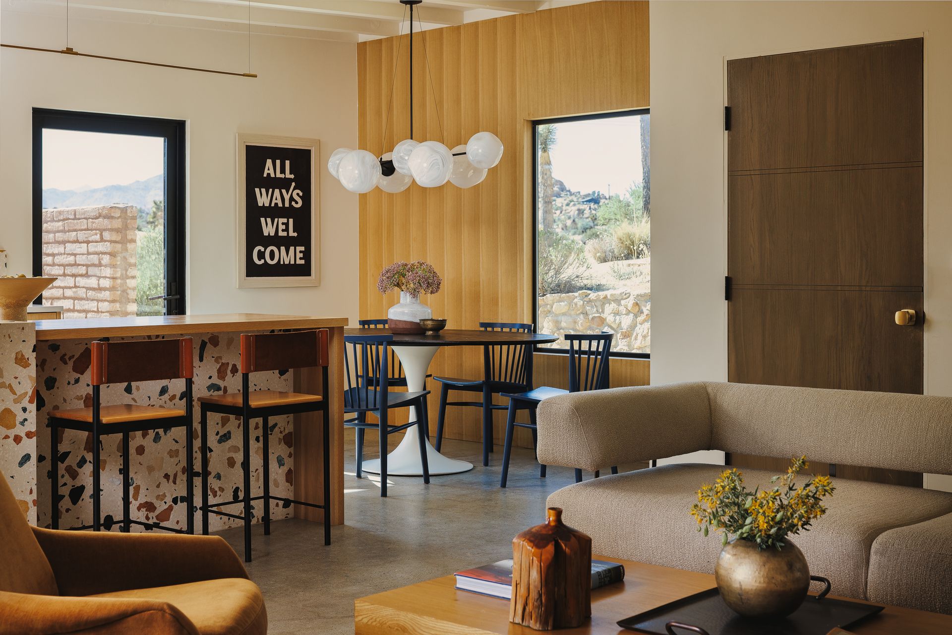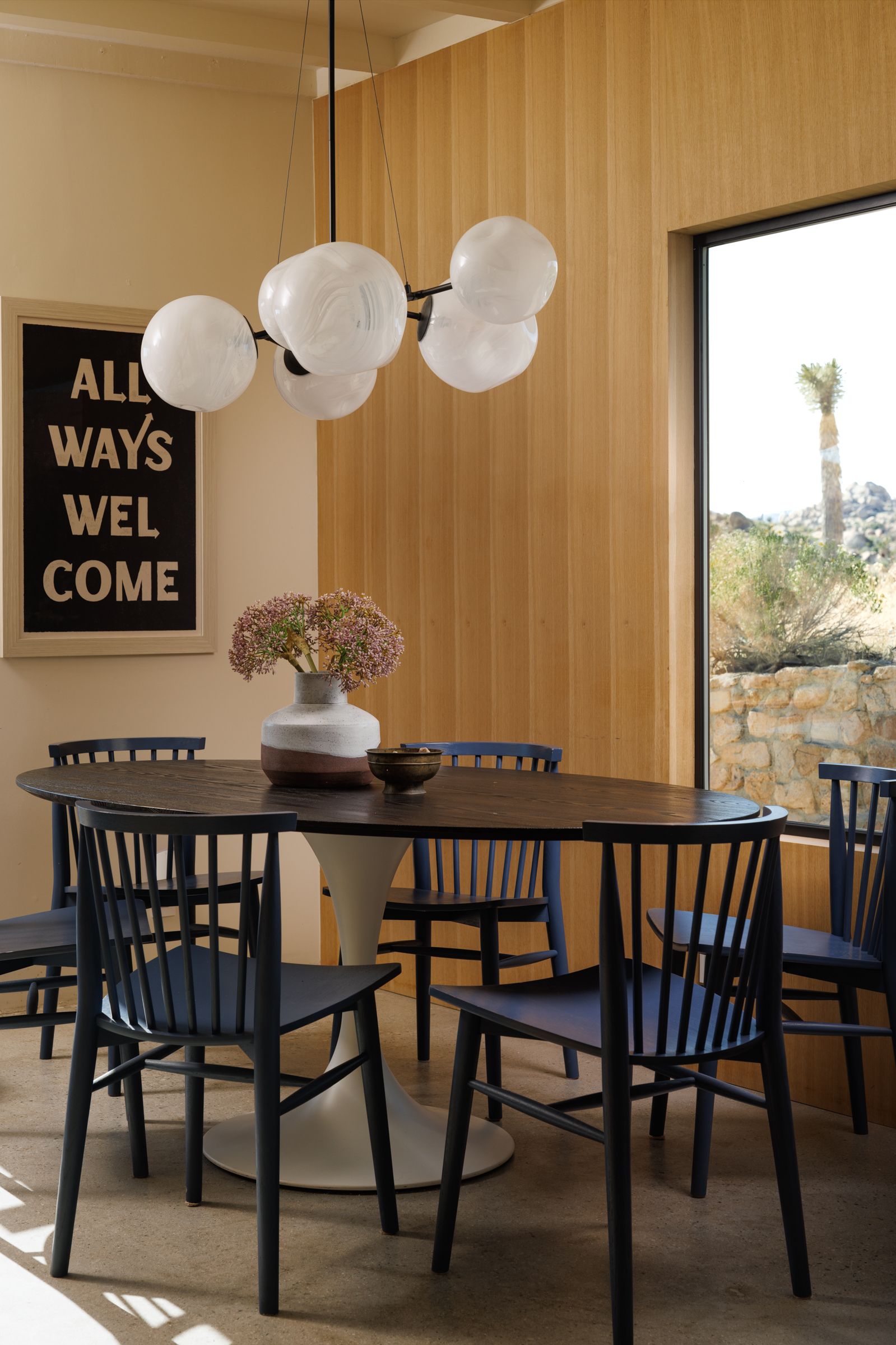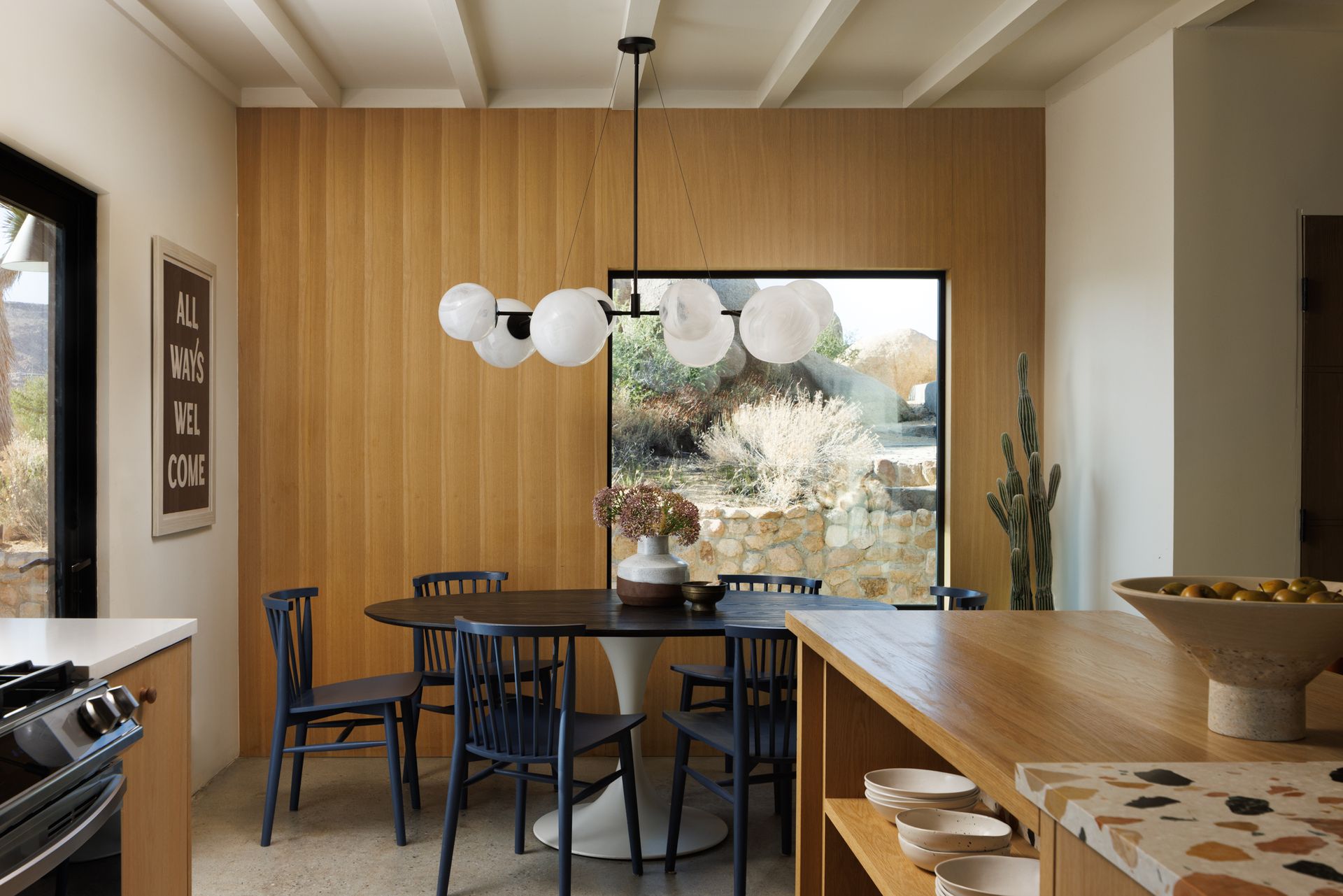 The owners wanted easier outdoor access than the existing front and back door provided. They planned to replace a fixed window in the dining area with a large glass door— we suggested re-using the window on an adjacent wall (with an asymmetrical 80s-inspired placement). We also paneled that wall to bridge the kitchen materials. A big-shouldered sofa, tulip table and painted spindle chairs check all the boxes here.