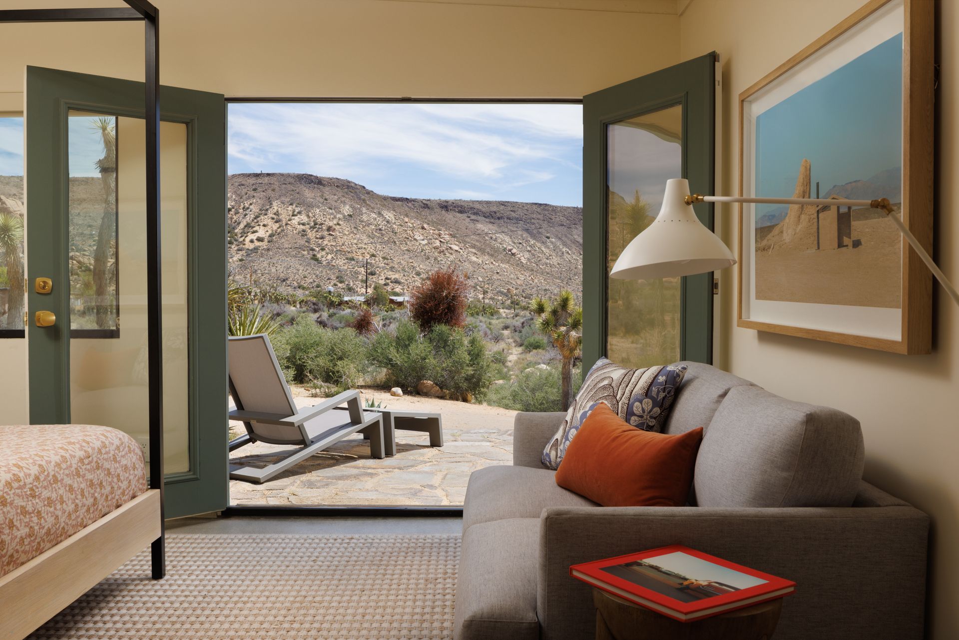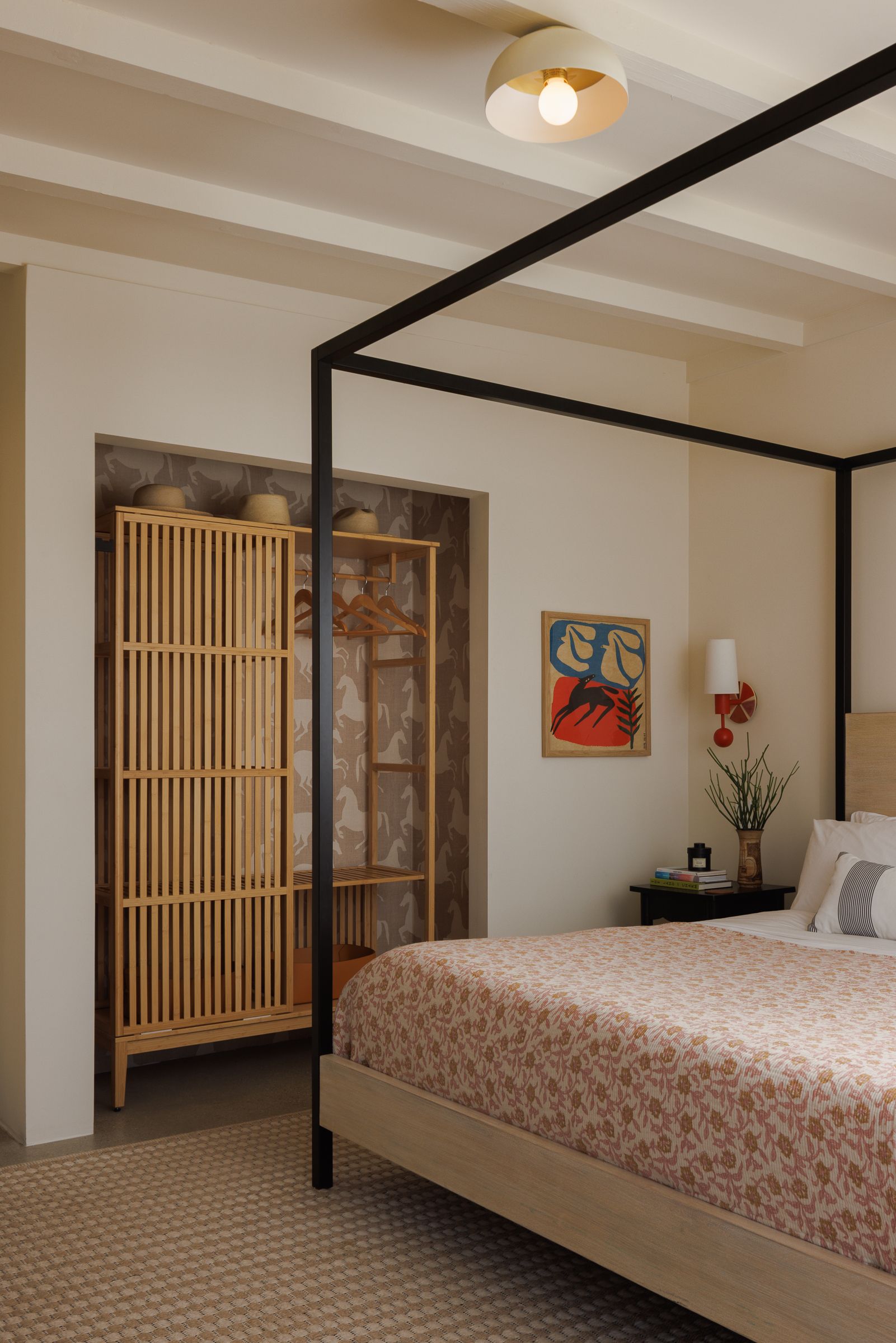 Bedrooms were opened up by replacing windows with French doors that lead to simple flagstone patios. Rather than install standard slider closets, we opted to leave them open, adding wallpaper and wood wardrobes. This ‘unfitted’ solution calls to mind country houses with their quirky nooks and lack of closets. Modern furniture in rustic profiles, checks and florals add to the country attitude while a photograph by Stephen Clouse (he created two images for their first desert home) has a decidedly new-wave composition and palette.