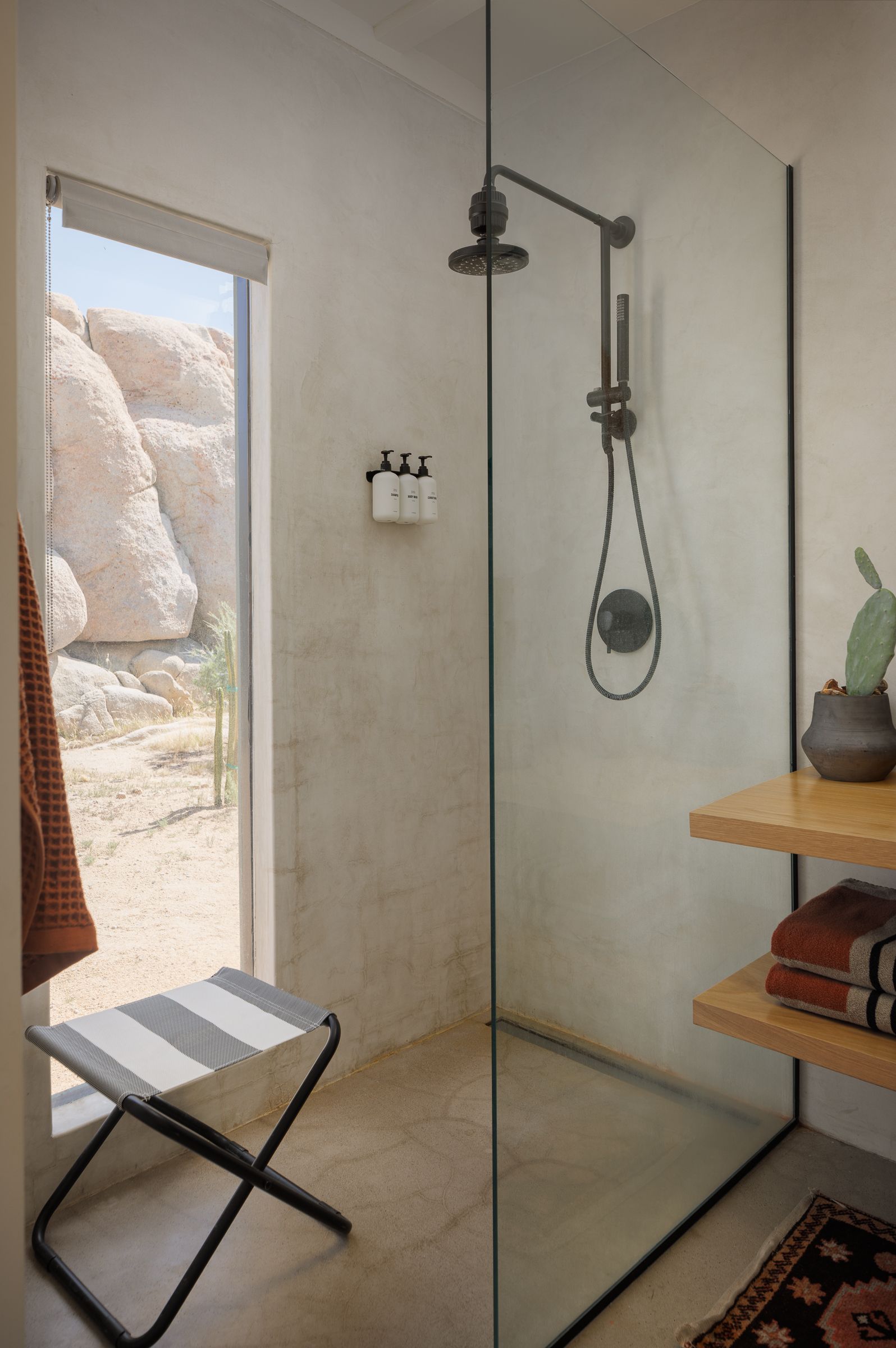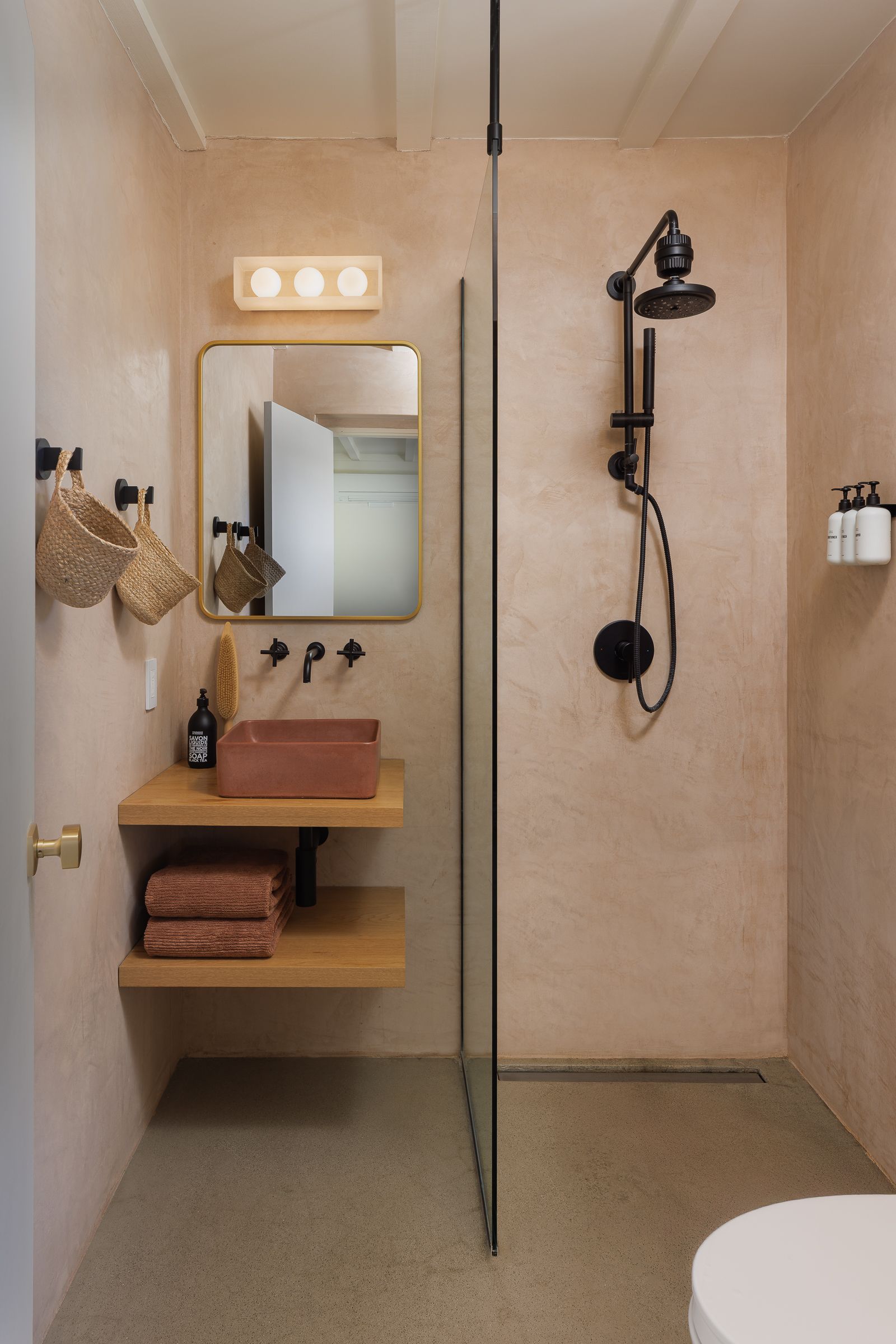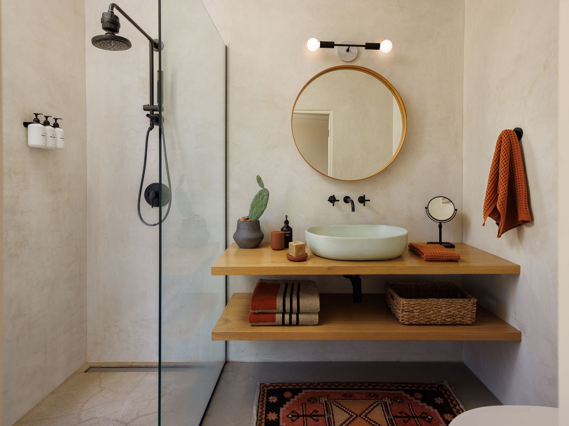 The bathrooms are treated in tadelakt and kept simple. A handmade ceramic sconce from Cedar and Moss with sandblasted porcelain bulbs provides the detail.
