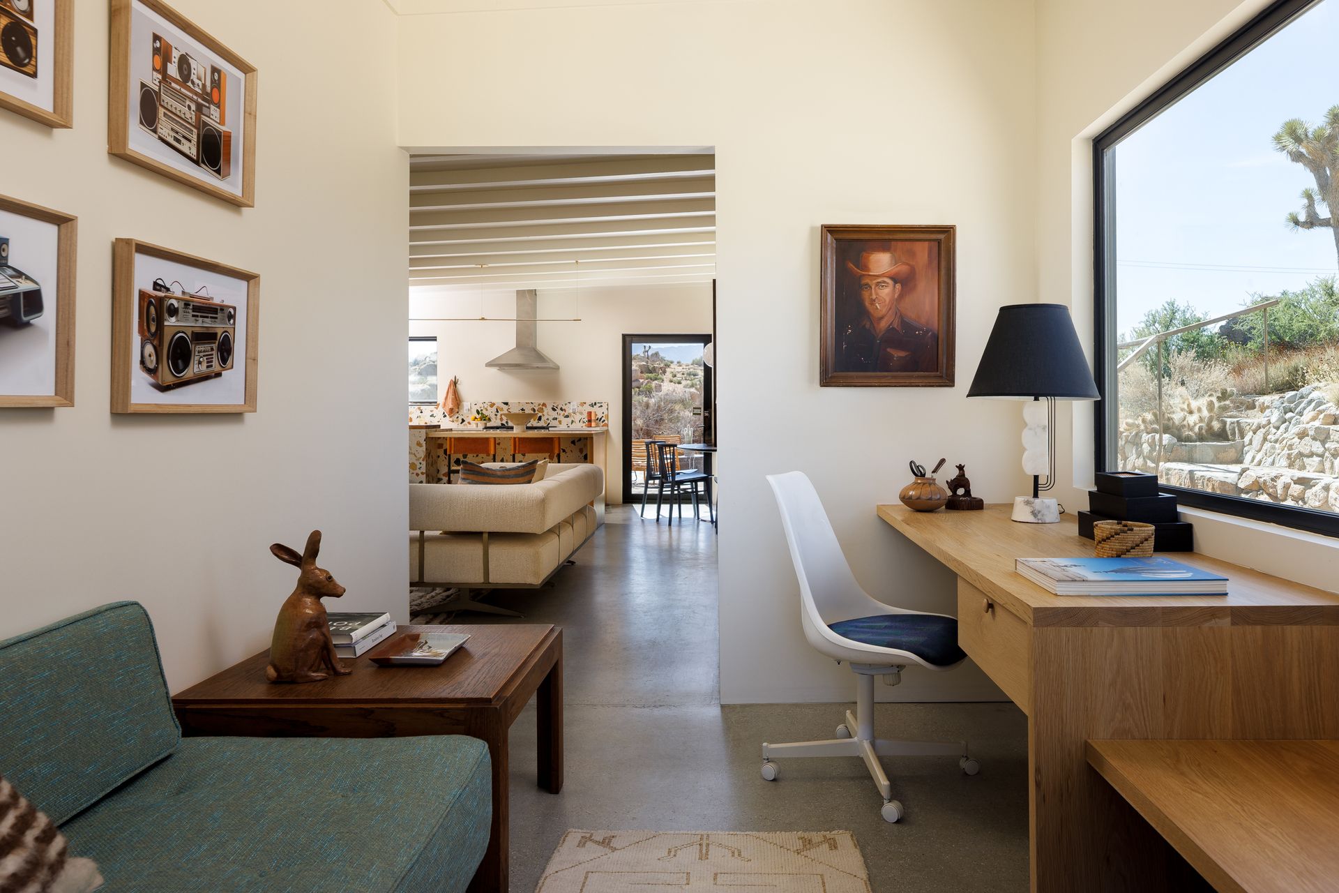 We created an office in the slender space on the west face of the house. Fire on the Mesa constructed the new desk, and we re-used a built-in bench from the dining area as an adjacent storage shelf. We found the vintage daybed at Urban Americana—recovered in a perfect turquoise fabric, no less. It doubles as an extra bed when the house is full. An anonymous cowboy portrait goes head-to-head with a collection of fantasy boom-boxes.