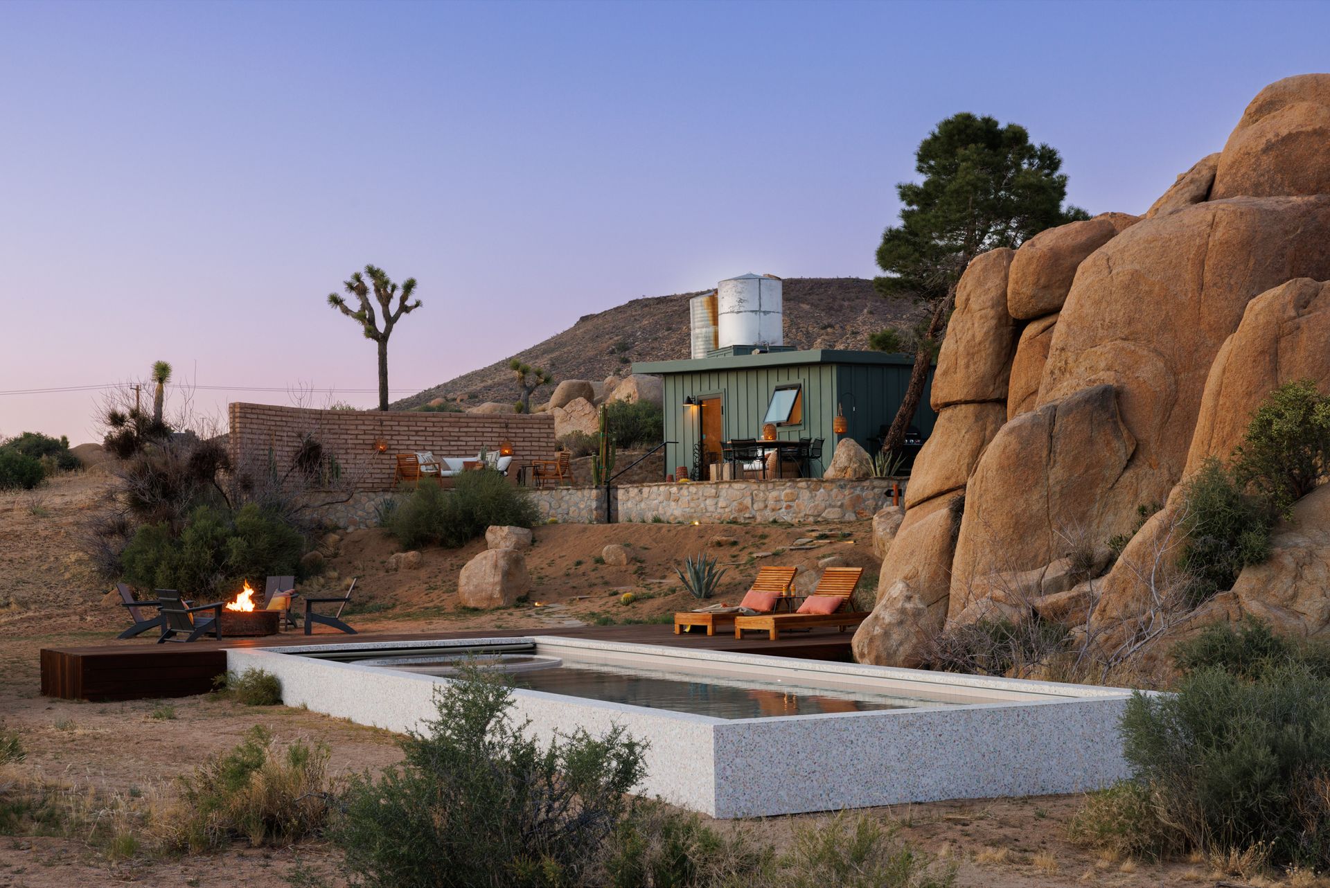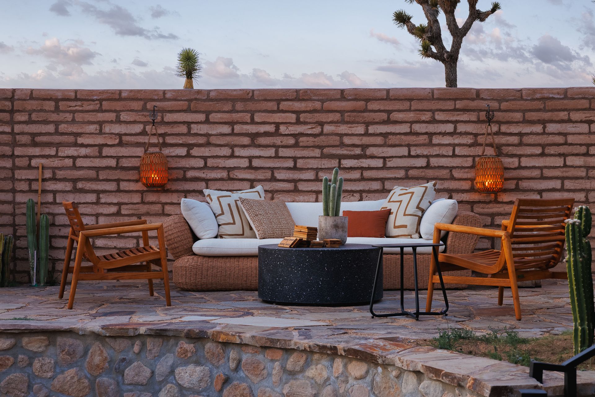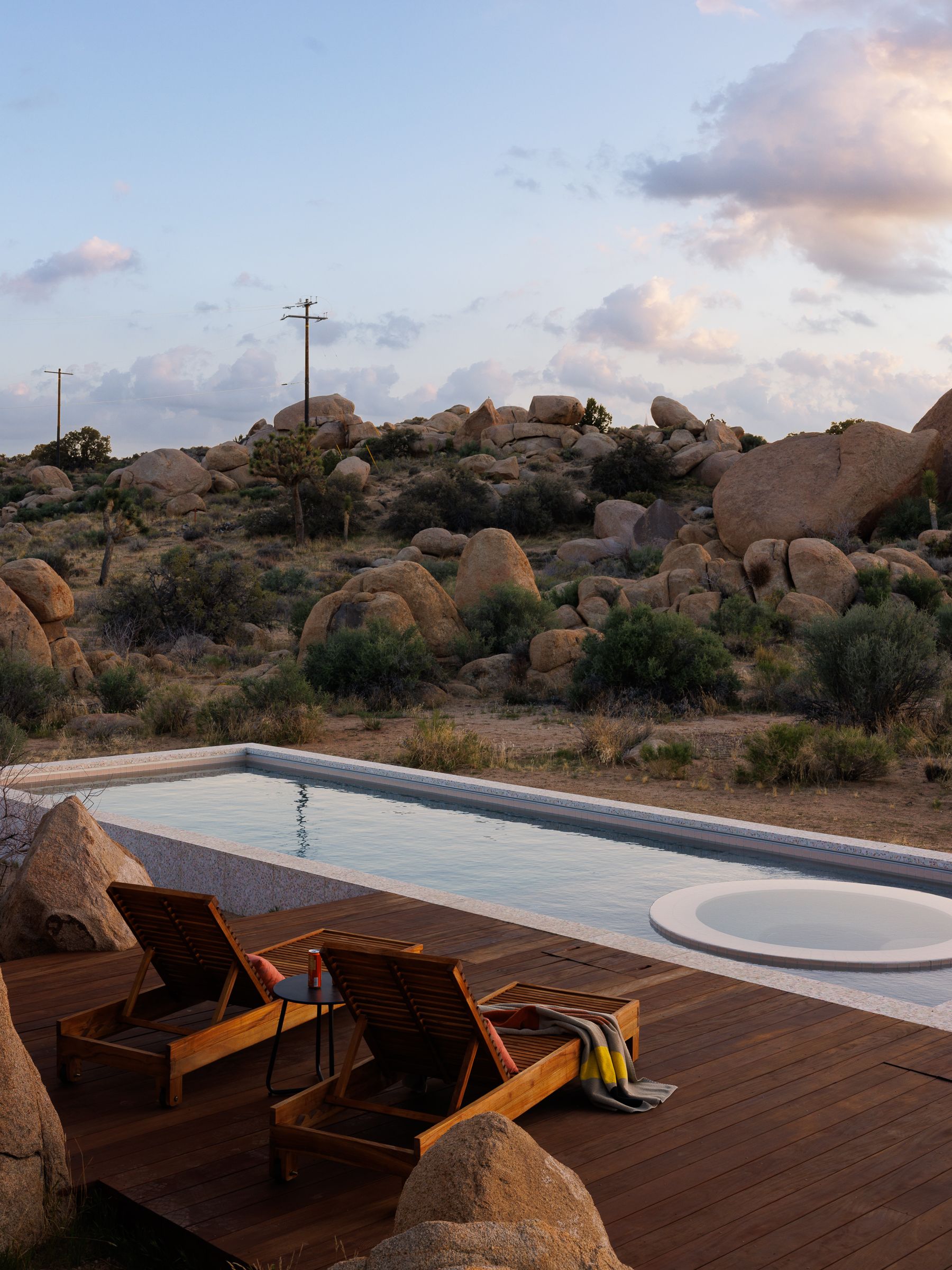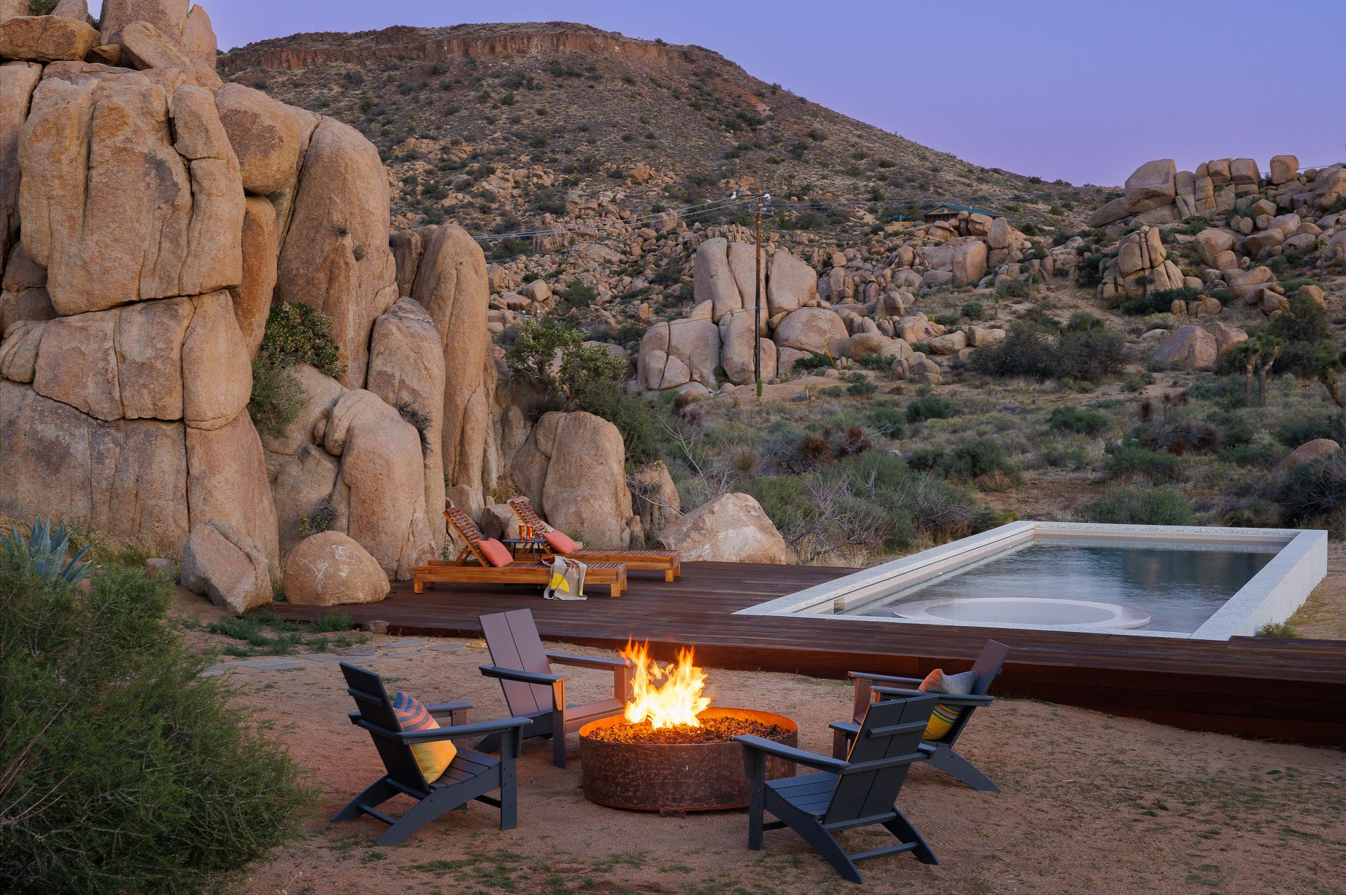The owners had designed a beautiful pool in their first high desert home, so the bar was set high. They also wanted to create an outdoor room that terraced down to the new pool, with a stop at the fire pit on the way. We suggested a retaining wall in stone to match an existing wall on the property. We took them to see a fieldstone pool surround in the low desert— the visit inspired the fieldstone patios adjacent to the house. And all of us were fans of the dark-grouted adobe walls at Pappy and Harriett’s down the road— so recreating one here was a no-brainer. Part windbreak and part folly, it defines the new outdoor room.